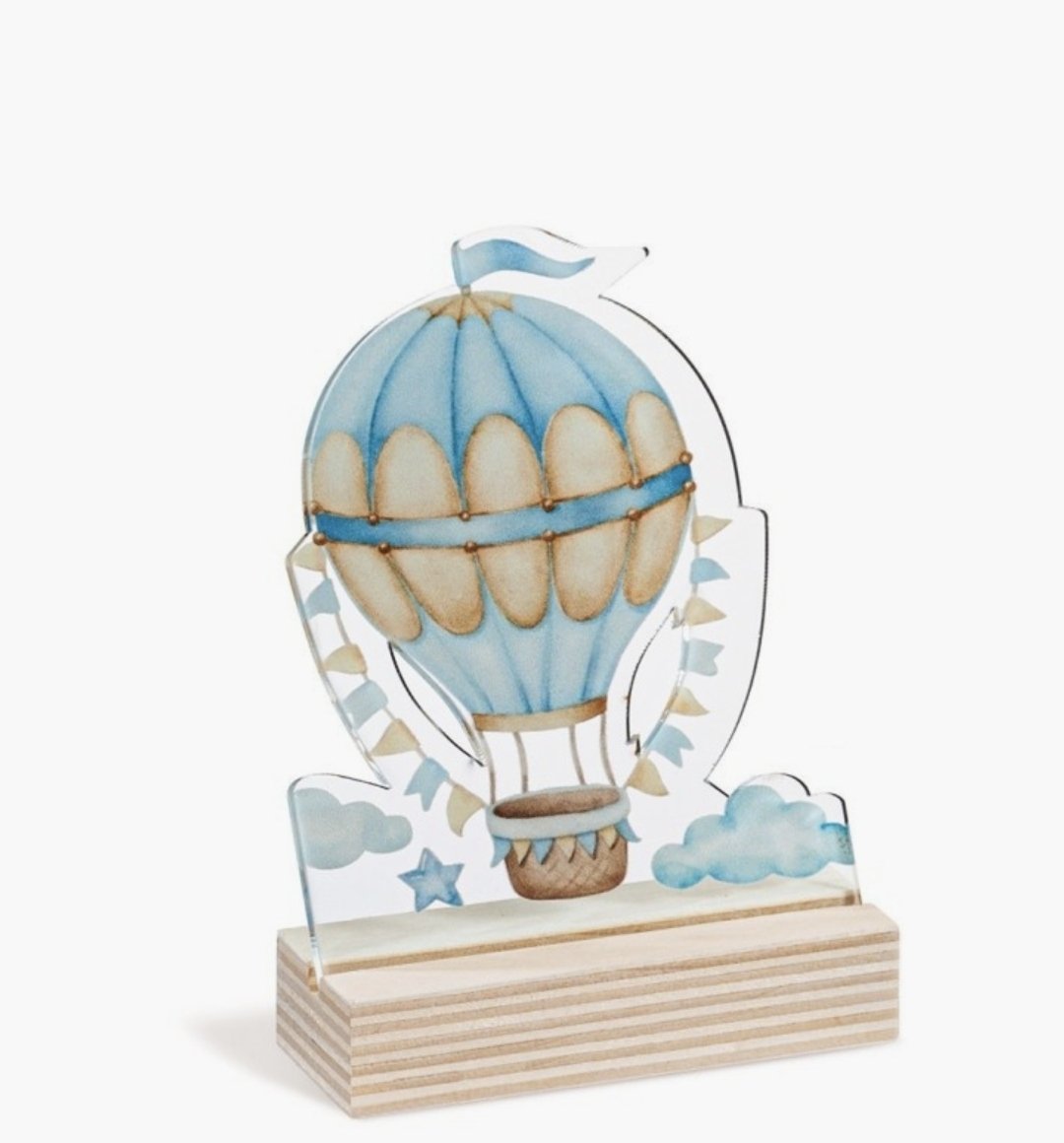 Μπομπονιέρα βάπτισης ξύλινη βάση με print plexiglass κοπτικό. Η παράσταση απεικονίζει ένα αερόστατο σε σιέλ αποχρώσεις.
