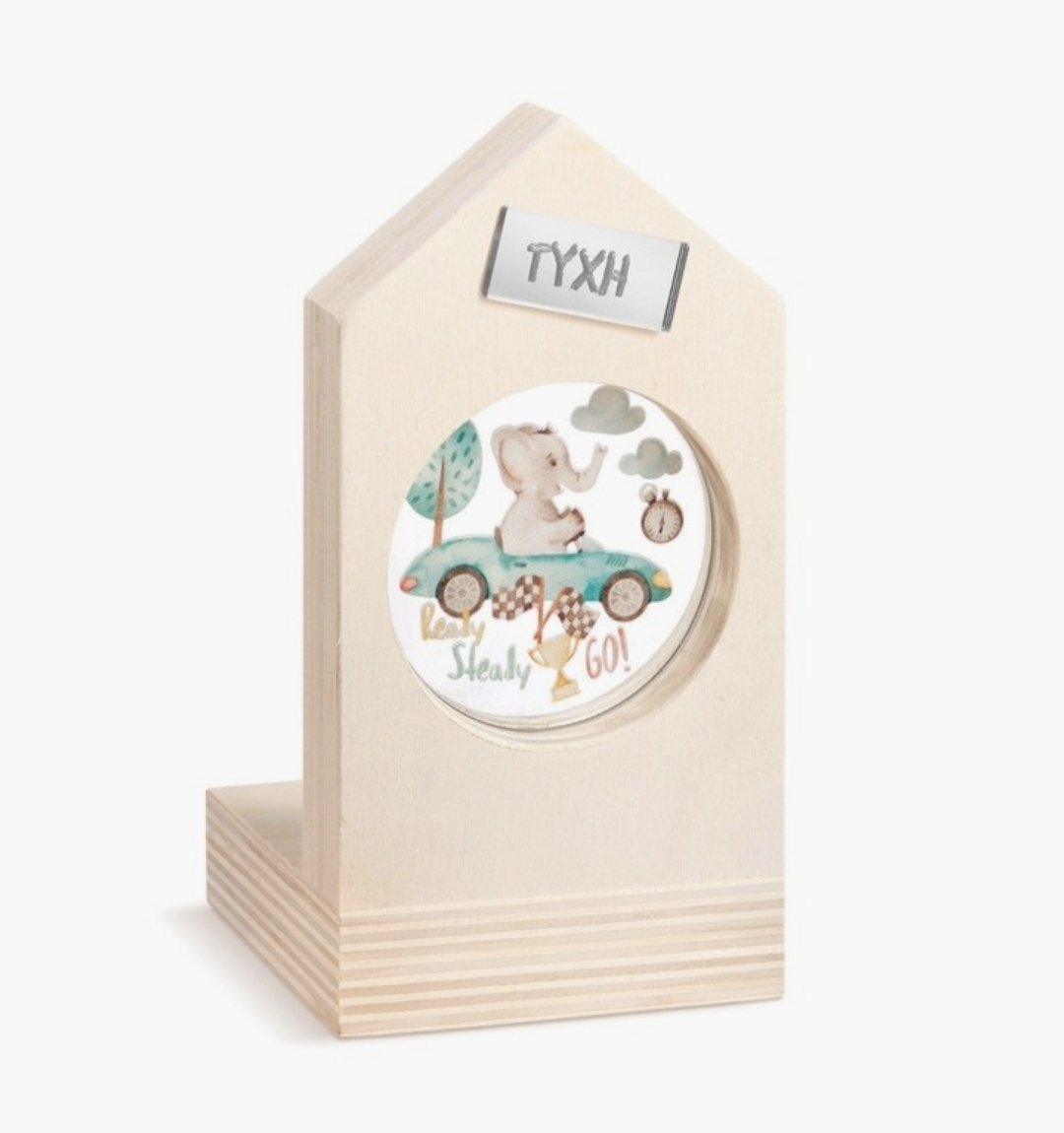 Μπομπονιέρα βάπτισης ξύλινο σπιτάκι ρεσώ. Το σπιτάκι είναι διακοσμημένο με στρογγυλό print plexiglass σε διάφανο χρώμα. Η παράσταση απεικονίζει το ελεφαντάκι να συμμετέχει σε αγώνες φόρμουλας και συνθημα READY- STEADY- GO