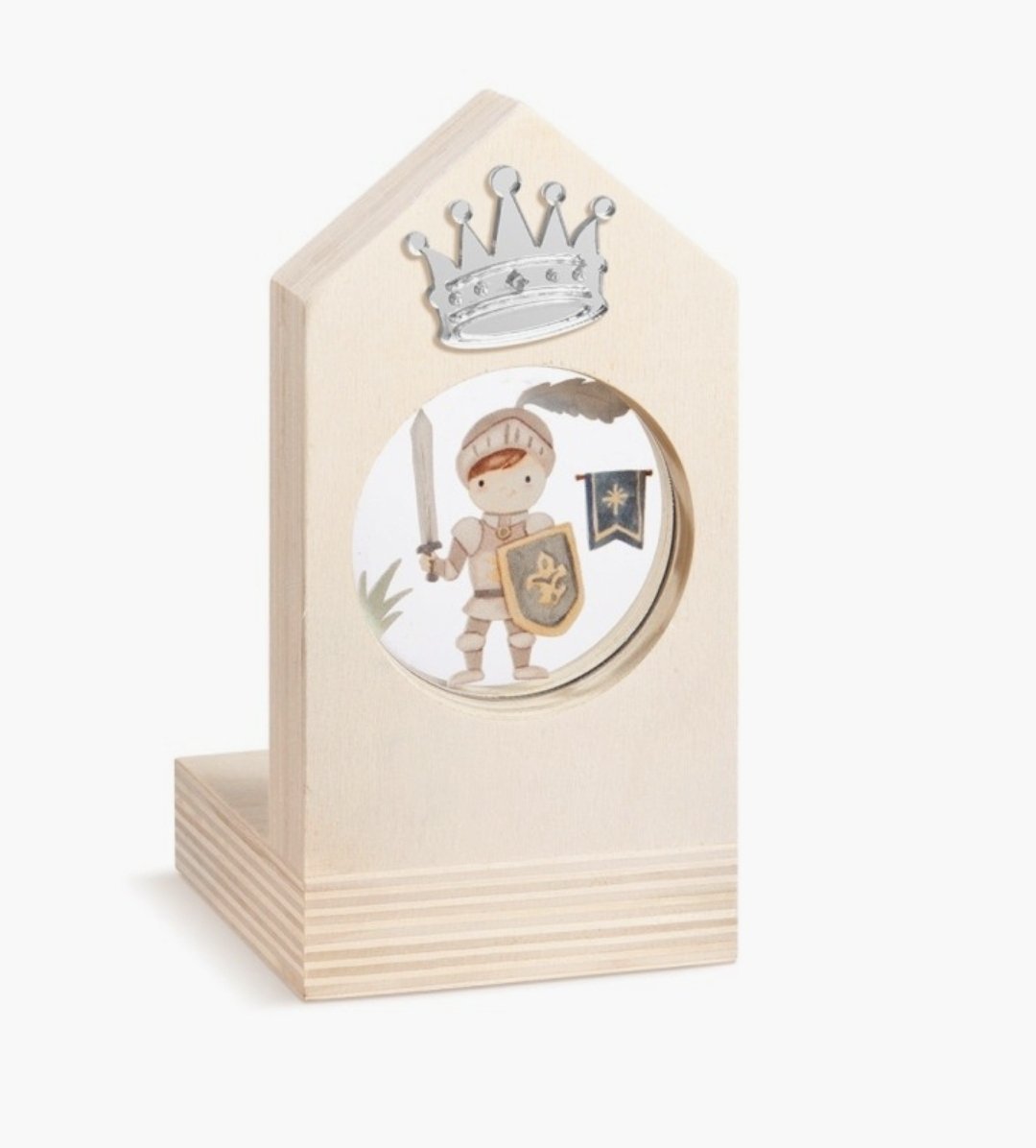 Μπομπονιέρα βάπτισης ξύλινο σπιτάκι ρεσώ. Το σπιτάκι είναι διακοσμημένο με στρογγυλό print plexiglass σε διάφανο χρώμα. Η παράσταση απεικονίζει τον ιππότη του παραμυθιού.