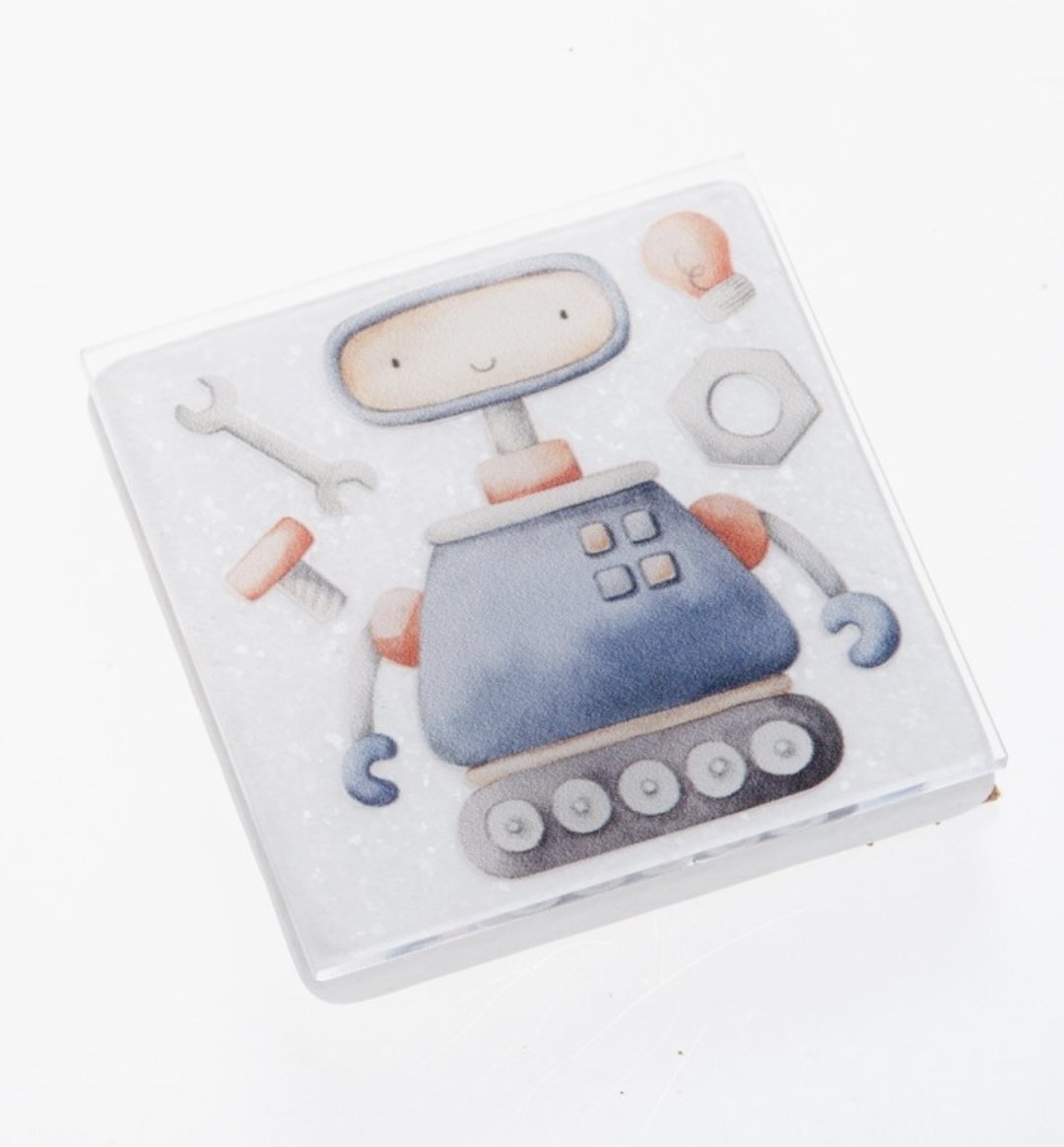 Σουβέρ από λευκό μάρμαρο και διάφανο plexiglass σε τετράγωνο σχήμα. Η παράσταση απεικονίζει ένα ρομπότ με φόντο διάφορα εργαλεία.