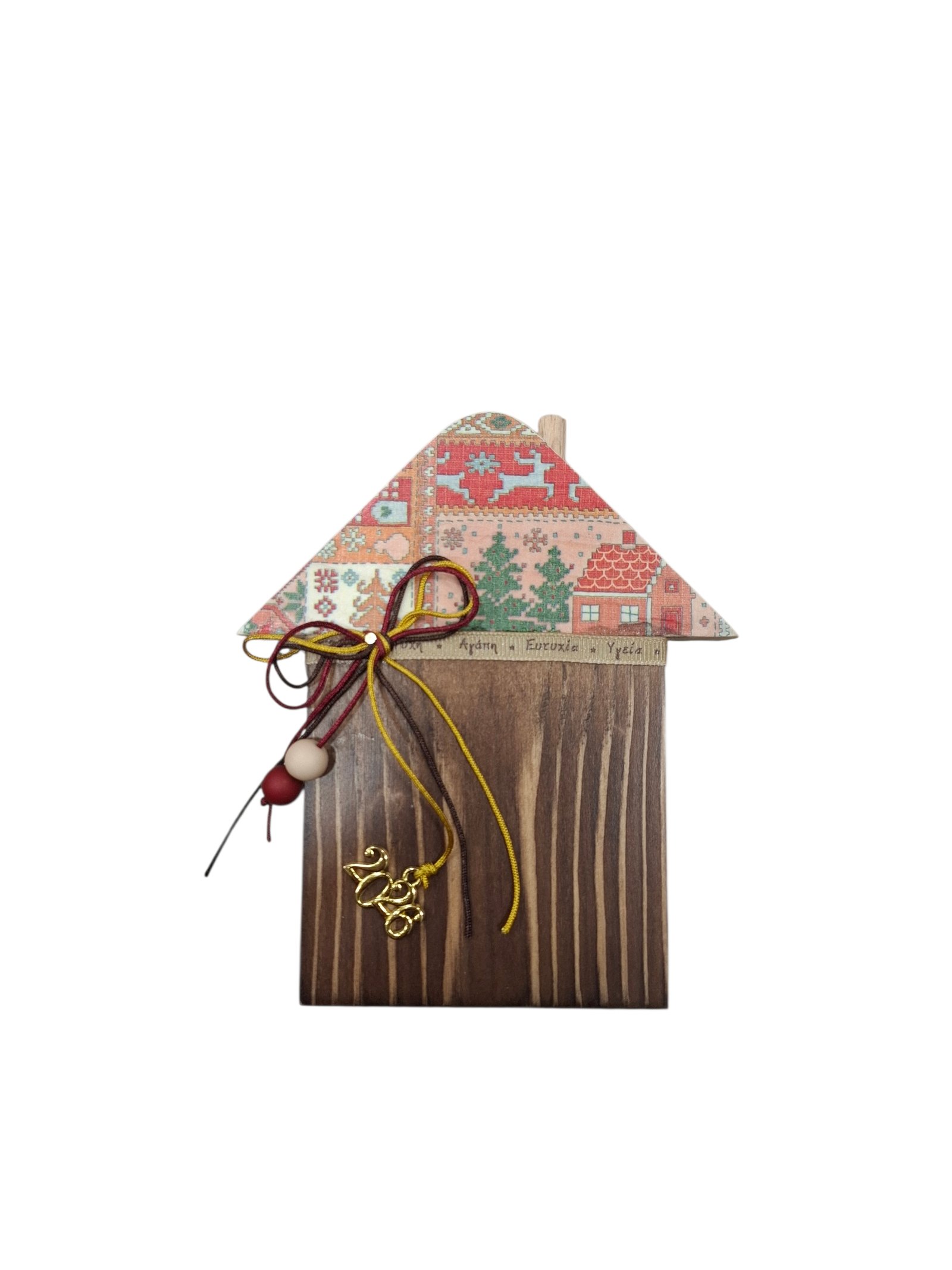 Ξύλινο διακοσμητικό σπίτι από πεύκο με την τεχνική του decoupage, ιδανικό για εποχιακή διακόσμηση ή δώρο. Συνδυάζει παραδοσιακές και σύγχρονες αισθητικές με προσεγμένα υλικά και λεπτομέρειες όπως χάντρες, μεταλλικά μοτίβα και κορδέλες.