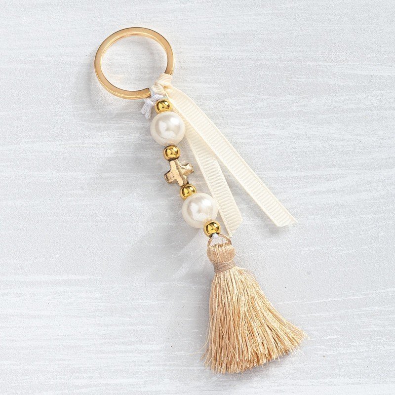 Μαρτυρικό μπρελόκ με περαστό χρυσό σταυρό, εκρού πέρλες και μπεζ φούντα. Συσκευασία 50 τεμαχίων