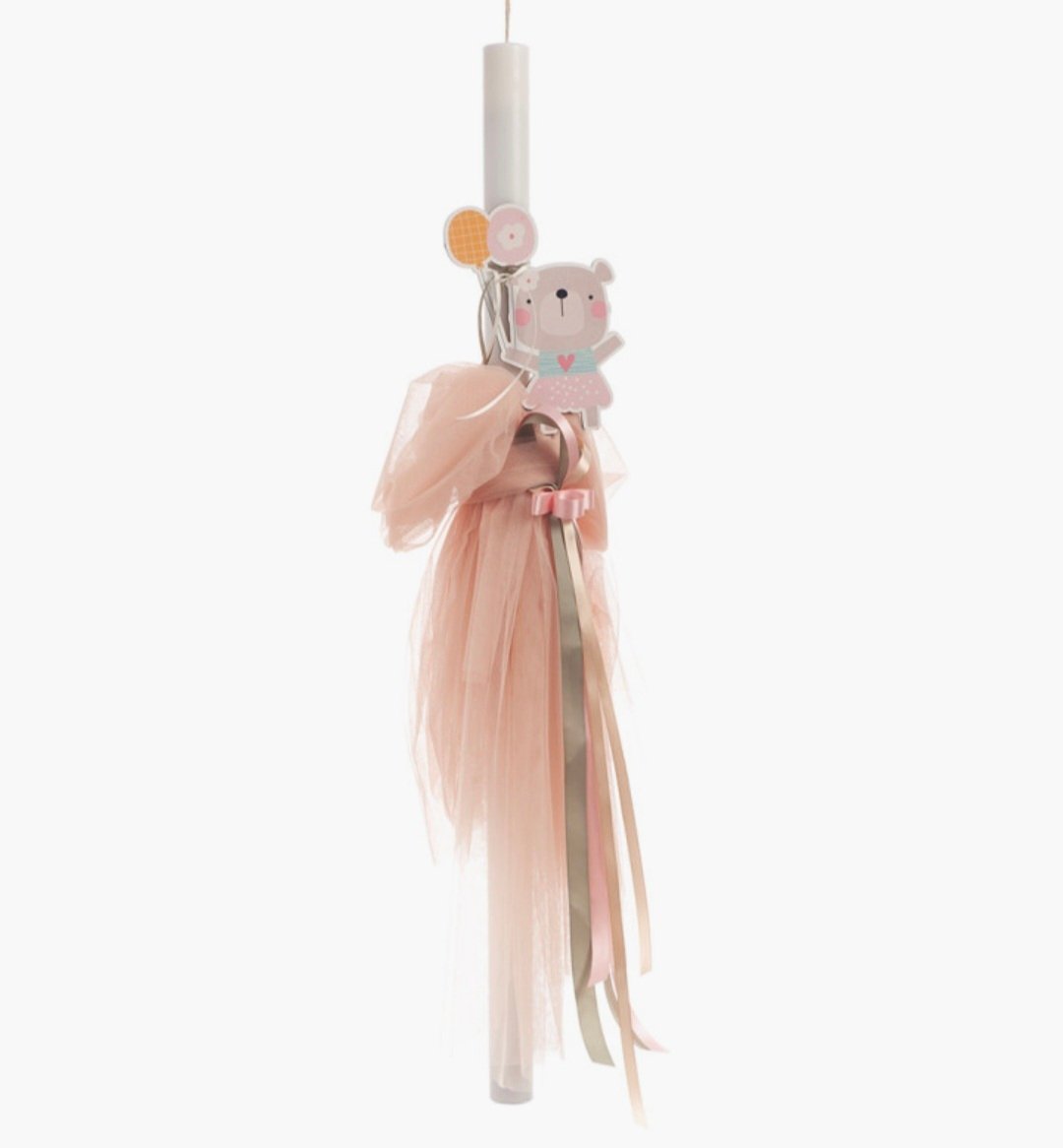 Λαμπάδα βάπτισης με ξύλινη παράσταση που απεικονίζει μια αρκουδίνα ροζ να κρατάει μπαλόνια. Η λαμπάδα είναι στολισμένη με χυτό σομόν τούλι. Ύψος περίπου 90cm